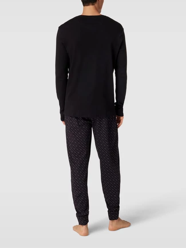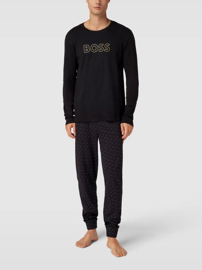 Der Pyjama von BOSS ist aus reiner Baumwolle gefertigt und gerade geschnitten. Das Oberteil kommt mit Label-Print. Die Hose zeigt sich mit Allover-Logo.