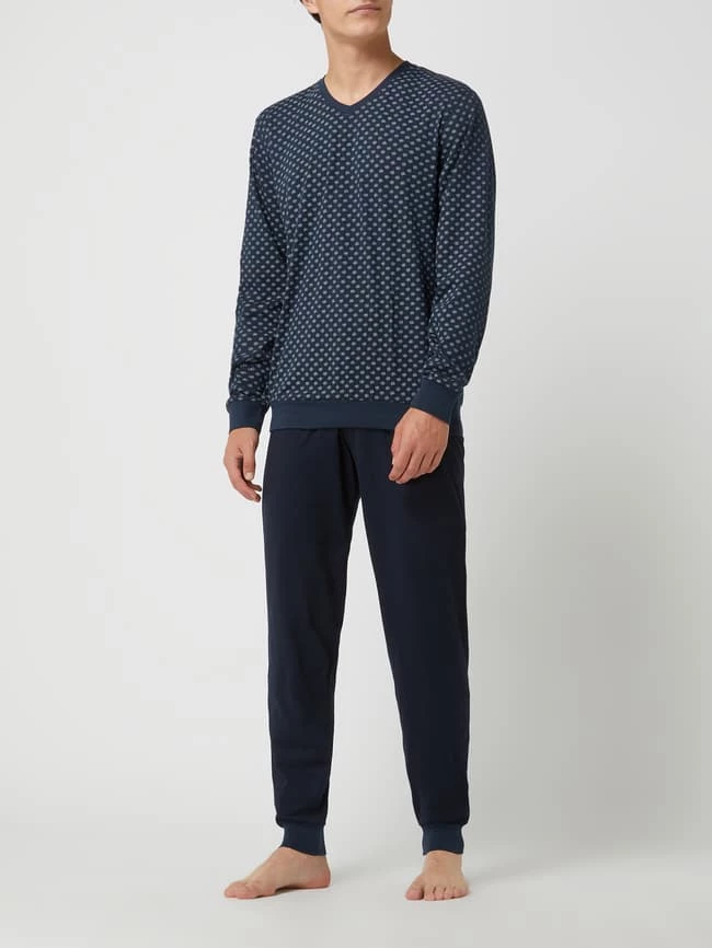 Der Pyjama von Bugatti ist aus reiner Baumwolle gefertigt und locker geschnitten. Das Oberteil kommt mit Allover-Muster, V-Ausschnitt und langen Ärmeln. Die Hose zeigt sich mit elastischem Bund und abgesetzten Beinabschlüssen.