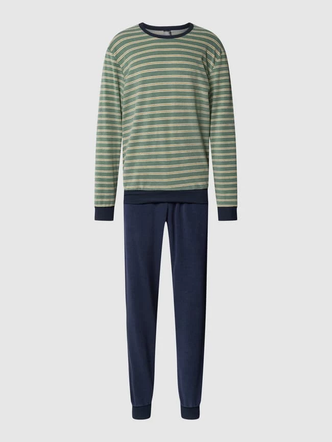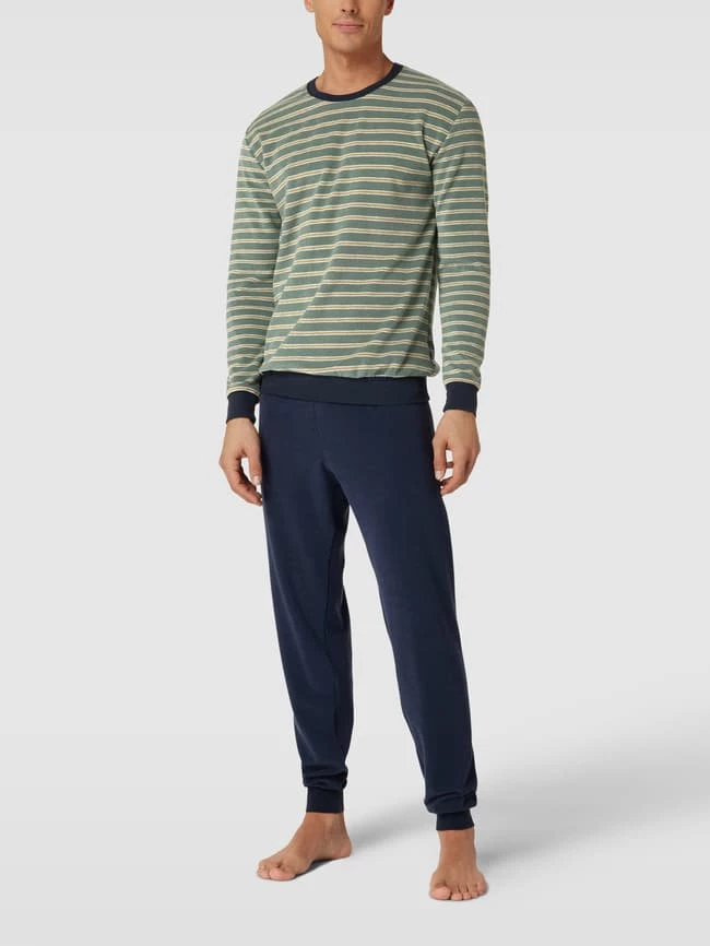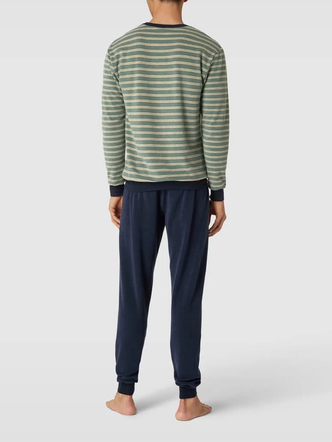 Der Pyjama von Calida ist aus einem Baumwoll-Mix mit Stretch-Anteil gefertigt und gerade geschnitten. Er kommt mit Oberteil mit Streifenmuster und Rundhalsausschnitt sowie mit Hose mit gerippten Abschlüssen.