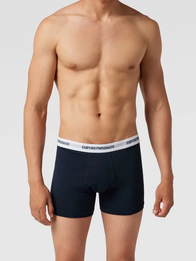 Die Trunks von Emporio Armani sind aus einem Baumwoll-Elasthan-Mix gefertigt und figurnah geschnitten. Sie kommen im 2er-Pack, mit elastischem Bund und Logo-Schriftzügen.