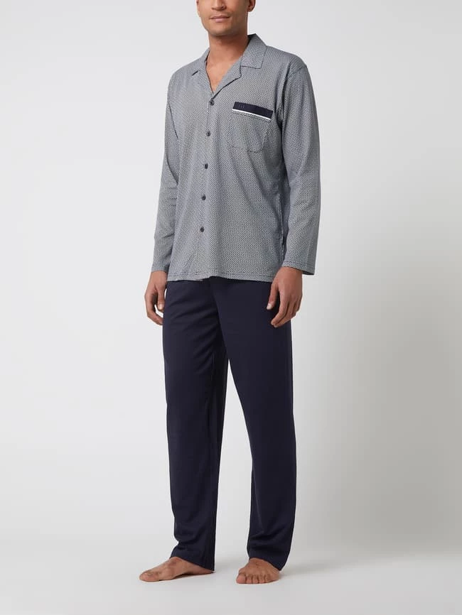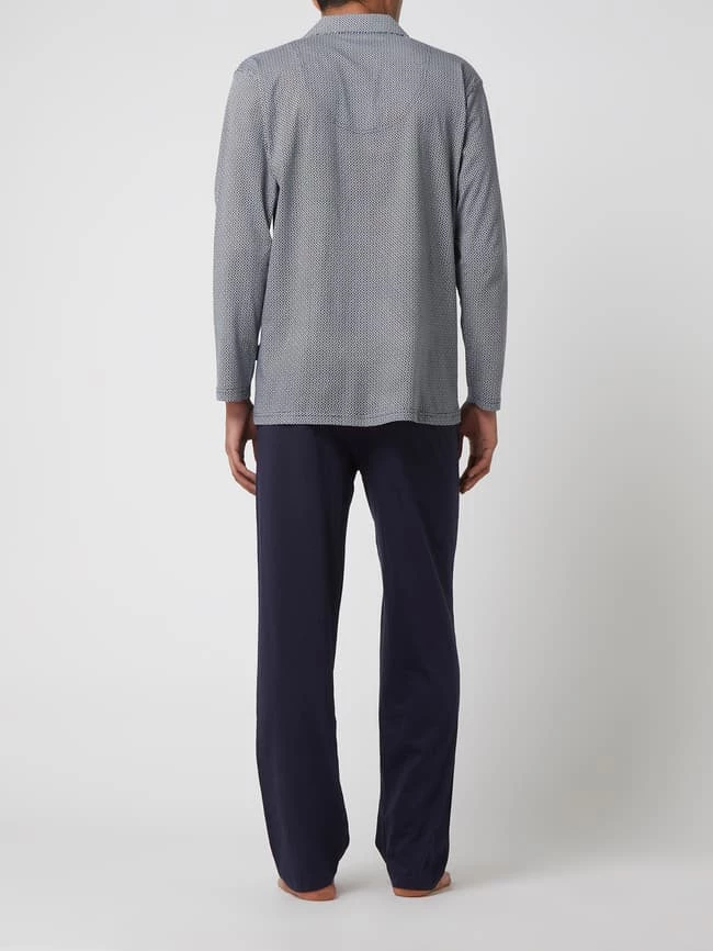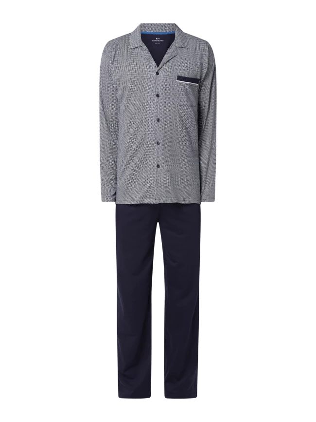 Der Pyjama von GÖTZBURG ist aus reiner Baumwolle gefertigt und locker geschnitten. Das Oberteil kommt mit Allover-Muster, Knopfleiste und Brusttasche. Die Hose zeigt sich mit elastischem Bund.