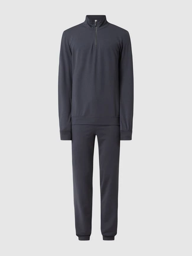 Der Lounge-Anzug von HOM ist aus einem Baumwoll-Modal-Elasthan-Mix gefertigt. Das Oberteil zeigt sich mit Stehkragen und kurzem Reißverschluss. Die Hose kommt mit Tunnelzug und Eingrifftaschen.